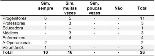 Na perspectiva dos pais e equipa médica e não-médica, as crianças gostam e valorizam a prática da actividade artística, sendo que 16 assinalaram aperceber-se do valor dado pelas crianças "Sim, muitas vezes", e 10 assinalaram "Sim, muitas vezes", como podemos observar na Tabela 5.